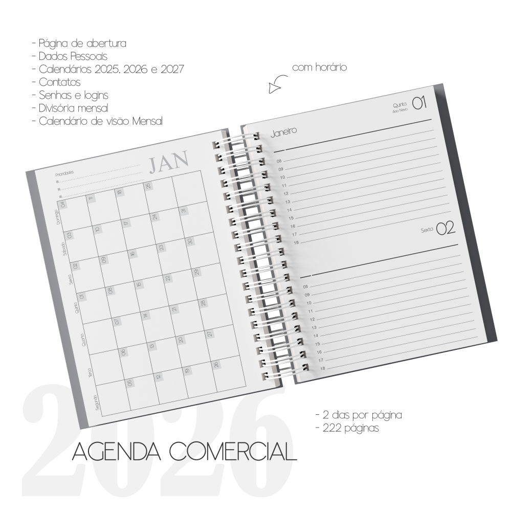 – Agenda 2 dias por página com horário das 8 às 18h – 222 páginas