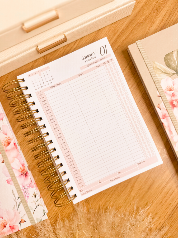 Páginas diárias com data, calendário do mês, agendamento com descrição, forma de pagamento e valor