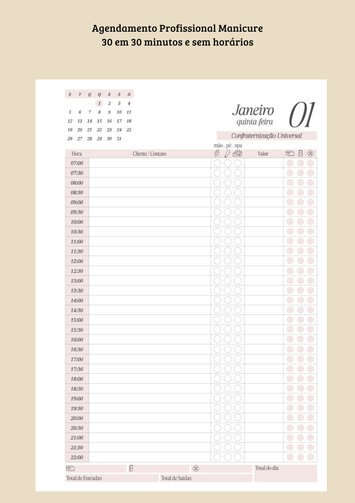 Páginas diárias com data, calendário do mês, agendamento com cliente/contato, pé, mão spa, forma de pagamento e valor