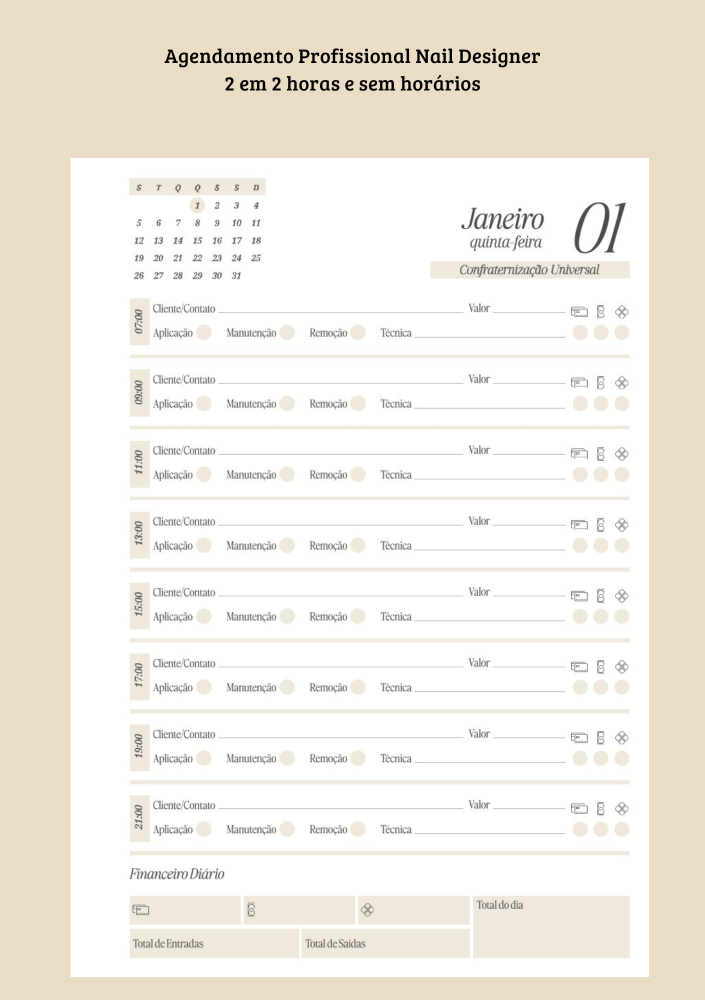 Páginas diárias com data, calendário do mês, agendamento com cliente/contato, aplicação, manutenção, remoção, técnica, forma de pagamento e valor