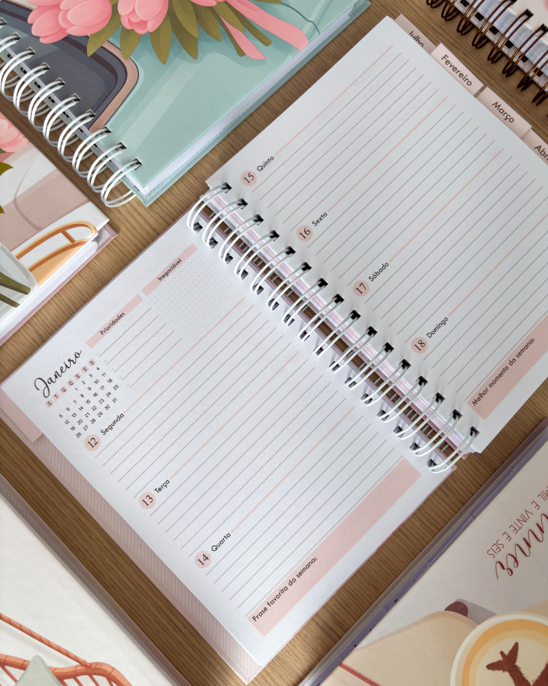 • Planejamento semanal datado com calendário em todas as páginas de início de semana.