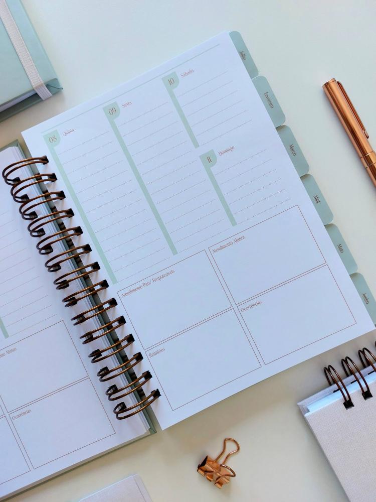 – Visão semanal na vertical com anotações de atendimento aos alunos, ao pais, reuniões e ocorrências.