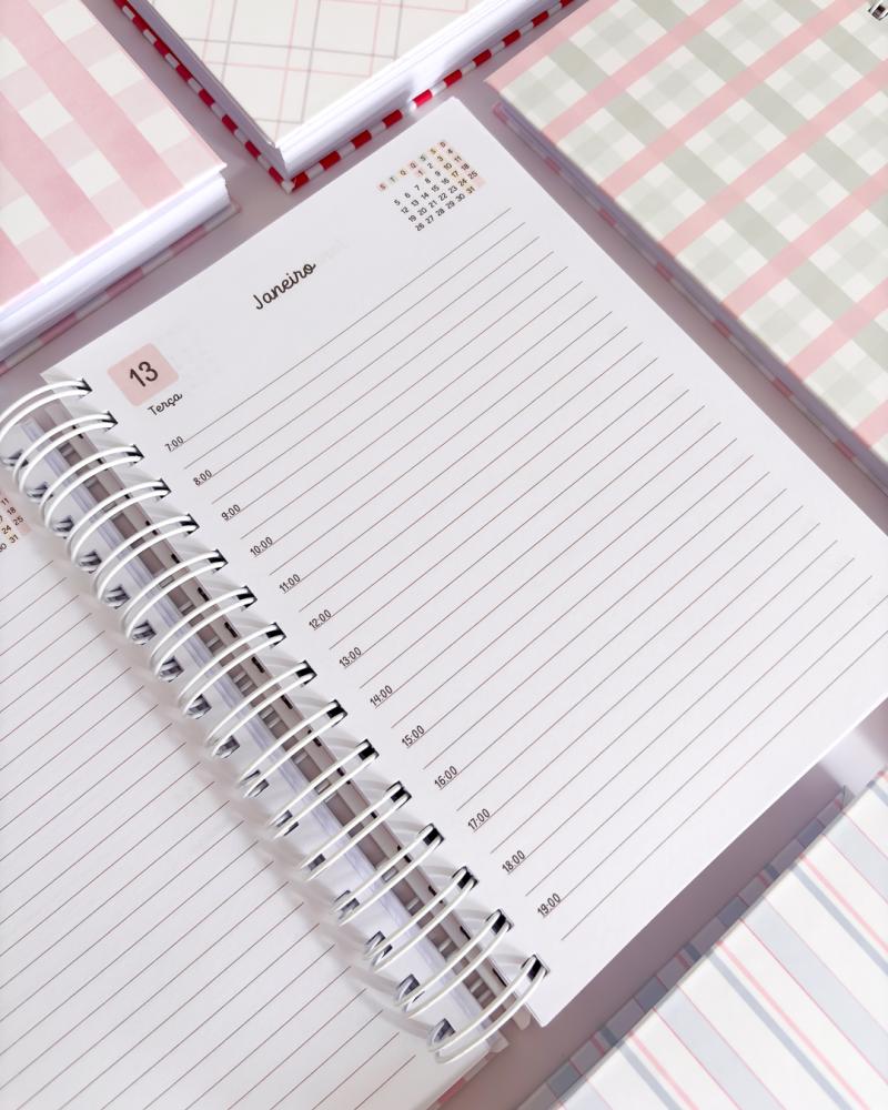 Brinde: Bolso interno, Marcador de páginas e fechamento em elástico ou botão
