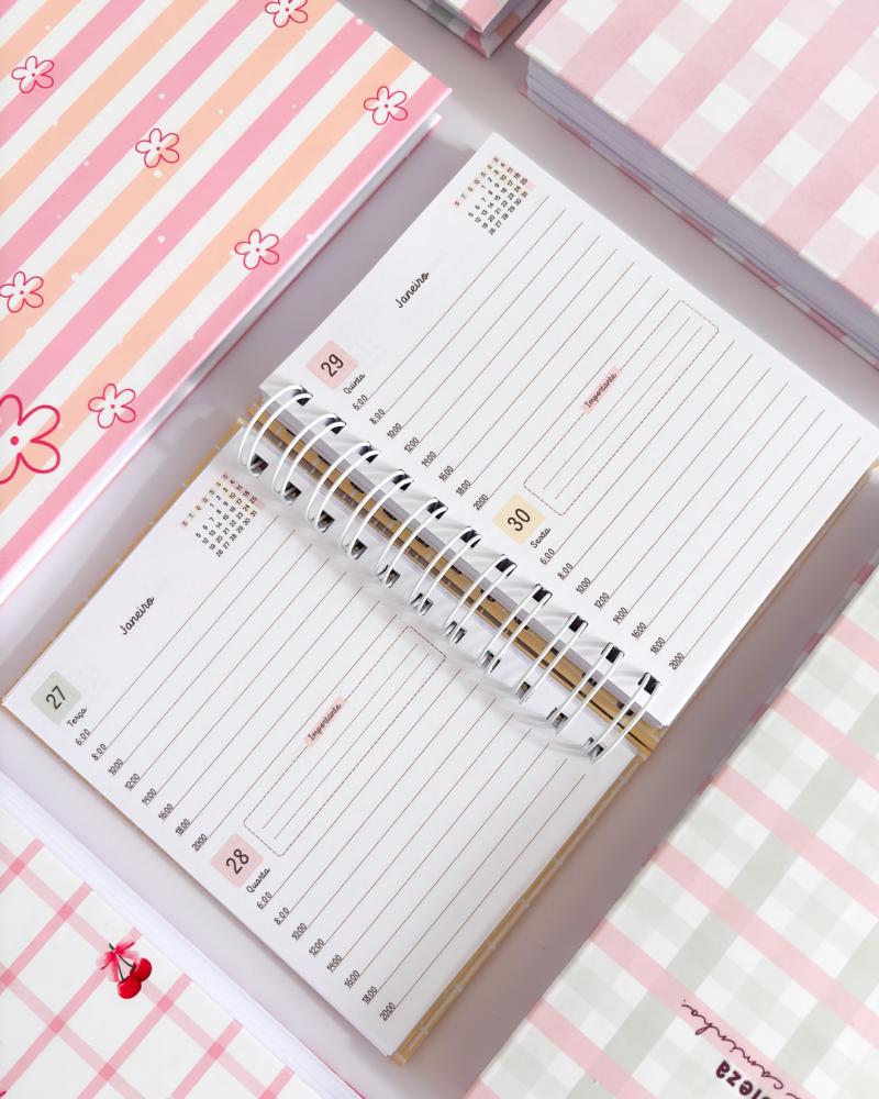 Brinde: Bolso interno, Marcador de páginas e fechamento em elástico ou botão