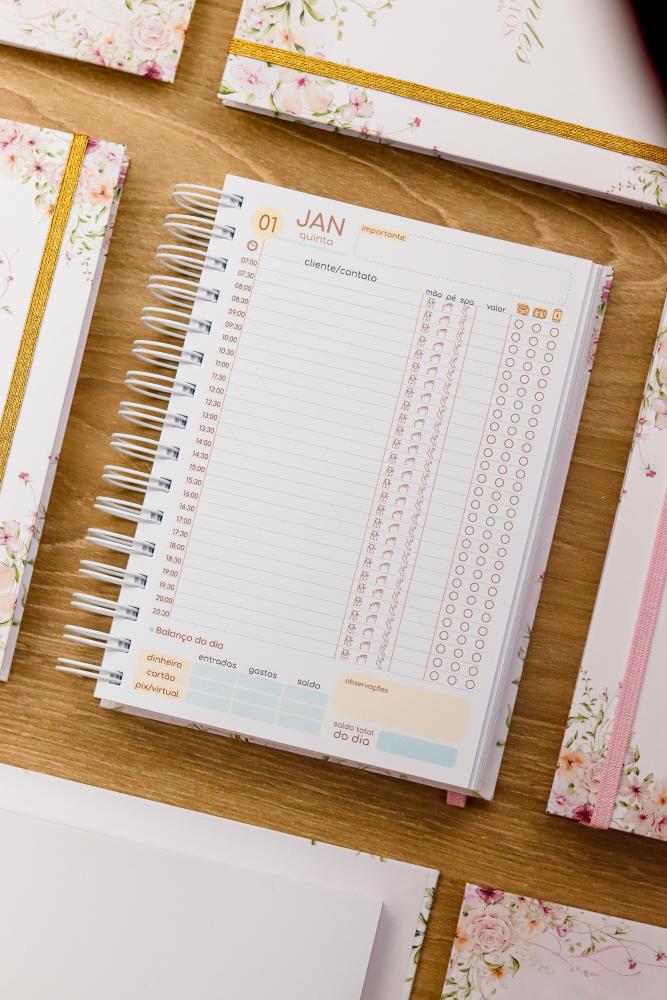 Brinde: Bolso interno, Marcador de páginas e fechamento em elástico ou botão