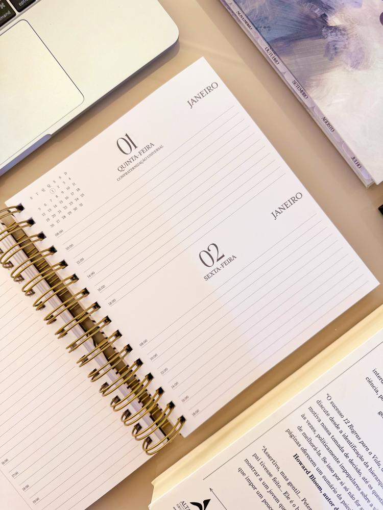 Brinde: Bolso interno, Marcador de páginas e fechamento em elástico ou botão