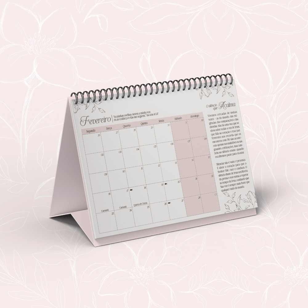Calendário em papelão rígido de 1,9mm, laminação fosca. Ele fica em pé sobre uma mesa.